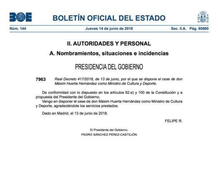 El Boletín Oficial del Estado (BOE) ha publicado este jueves el cese de Màxim Huerta como ministro de Cultura y Deporte y el nombramiento de quien le habrá de sustituir en un cargo que sólo ha ocupado durante seis días, el exdirector del Reina Sofía José Guirao.