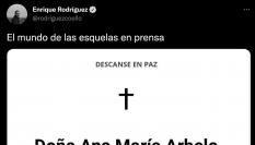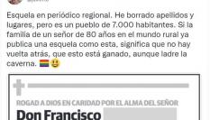 La esquela la ha compartido en Twitter la periodista Esther Puisac. “Esquela que cuenta una historia sin contarla. Pájaros que vuelan y libertad de decidir”, ha escrito.