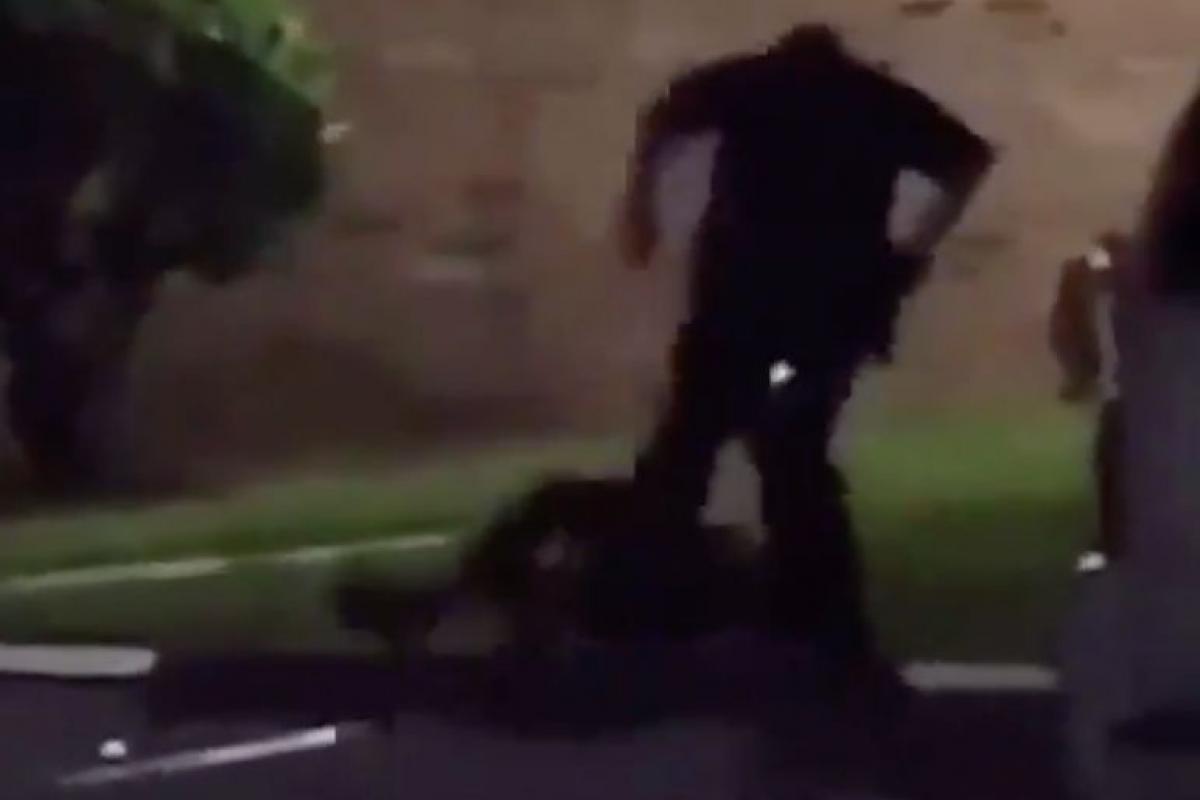 Luego se produce una pelea, en la que la mujer le pregunta a gritos "¿Por qué?", pero el oficial no responde y sigue intentando arrestar a la mujer, quien agita los brazos y grita: "Estoy embarazada".