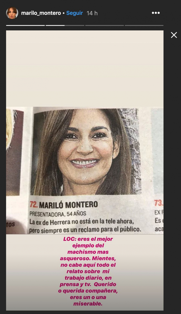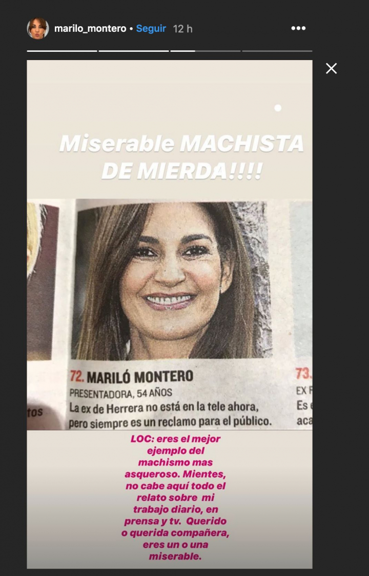 “Eres el mejor ejemplo del machismo más asqueroso. Mientes, no cabe aquí todo el relato sobre mi trabajo diario, en prensa y televisión. Querido o querida compañera, eres un o una miserable”, se puede leer en una historia posterior.