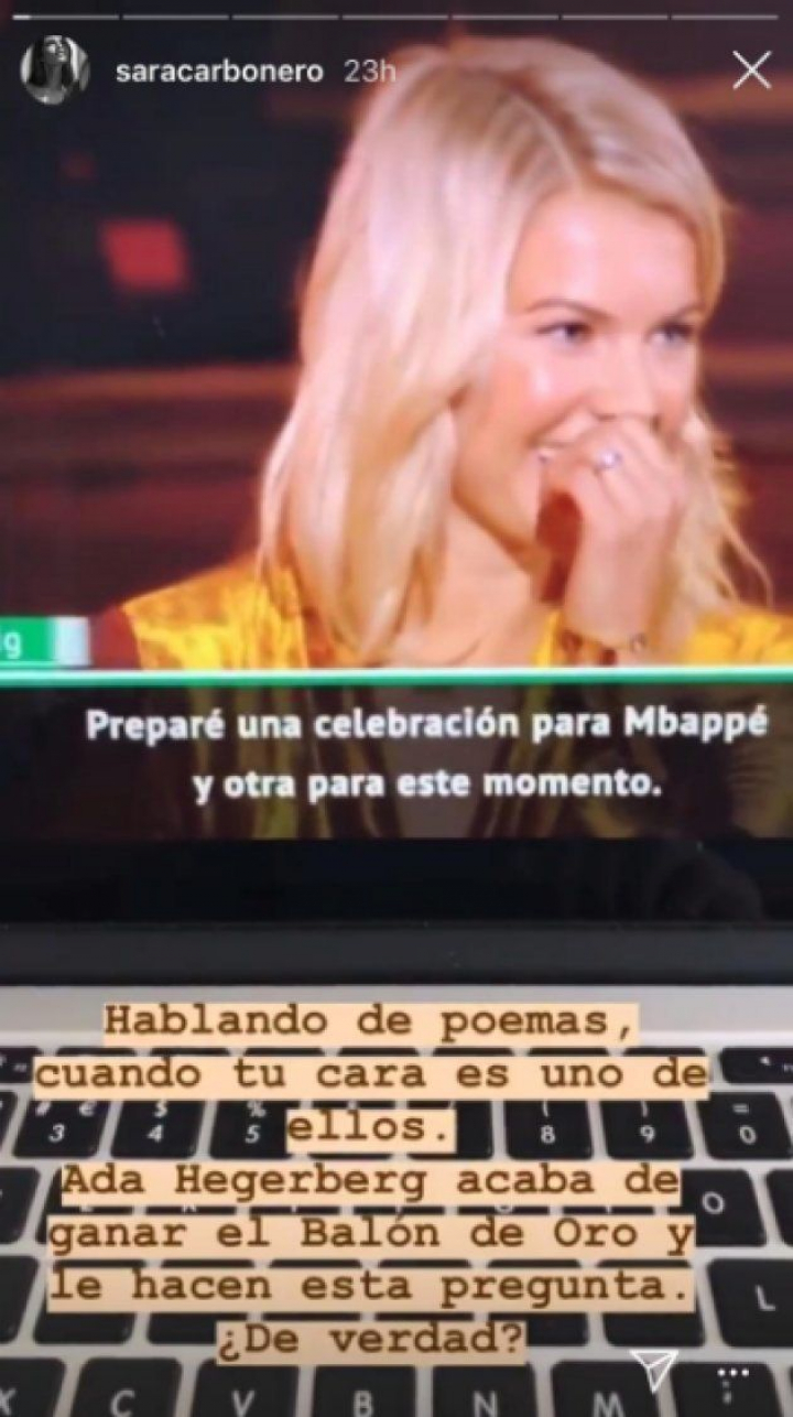"Hablando de poemas, cuando tu cara es uno de ellos. Ada Hegerberg acaba de ganar el Balón de Oro y le hacen esta pregunta, ¿de verdad?", se ha preguntado Carbonero en su cuenta de Instagram.