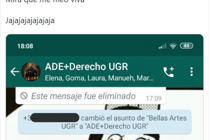 ¿A qué se debió ese extraño cambio? La misma persona que lo modificó lo explicó luego: “Hola chicxs. Si no os importa, voy a cambiar el nombre del grupo a ADE+Derecho UGR un rato. Os explico, me vine a Granada el año pasado a estudiar bellas artes y los fachas de mis padres creen que estoy estudiando esa carrera”.