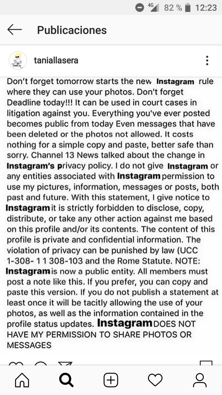 Tras este aviso, el texto denuncia que “Instagram tiene prohibido revelar, copiar, distribuir o utilizar” contra sus usuarios. Y mencionan las políticas de UCC (Uniform Comercial Code) y el Estatuto de Roma de las Naciones Unidas.