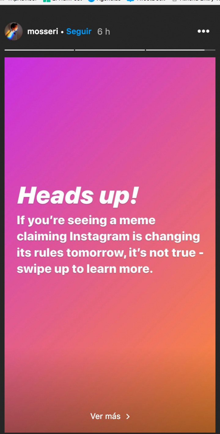 Desde la compañía señalan que se trata de un bulo e incluso el CEO de la compañía, Adam Mosseri, ha alertado sobre este post viral en sus historias de Instagram. ”¡Atención! Si estás viendo un meme que dice que Instagram cambiará su política de privacidad mañana, no es verdad”, ha escrito Mosseri, que ha enlazado su story a un artículo en la revista WWD en el que otra responsable de la compañía señala que es falso.