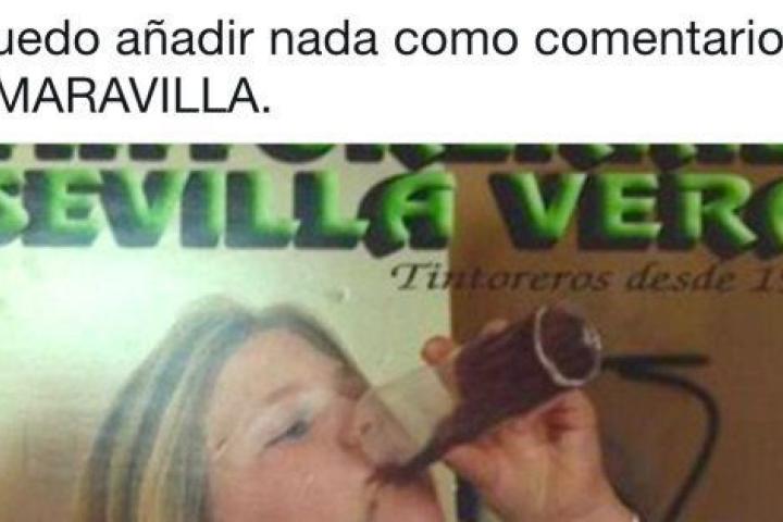 "No puedo añadir nada como comentario", anunciaba el propio tuitero. Y es que no es para menos. En el cartel de la Tintorería Sevilla Vera se puede ver a una niña con el vestido de la primera comunión bebiendo de un vaso y poniendo su indumentaria perdida de algún líquido oscuro.