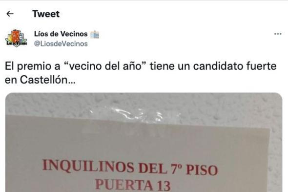 “El premio a ‘vecino del año’ tiene un candidato fuerte en Castellón…”, ha escrito junto a la foto del cartel que ha dejado alguien a los “inquilinos del 7º piso puerta 13″.