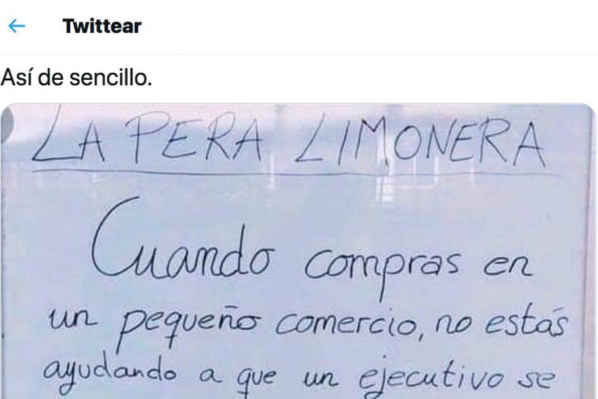 “Cuando compras en un pequeño comercio no estás ayudando a que un ejecutivo se compre su tercer apartamento en playa”, empieza el mensaje escrito en una pizarra a mano.
