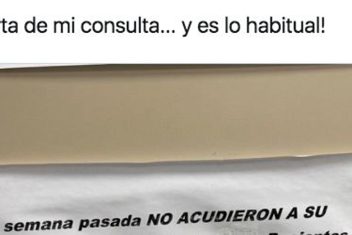 “En la puerta de mi consulta... y es lo habitual”, ha escrito el usuario. En el citado cartel se puede leer: “La semana pasada no acudieron a su cita en esta consulta 31 pacientes. Si estos pacientes hubiesen anunciado sus citas, vd. podría haber sido atendido antes”.