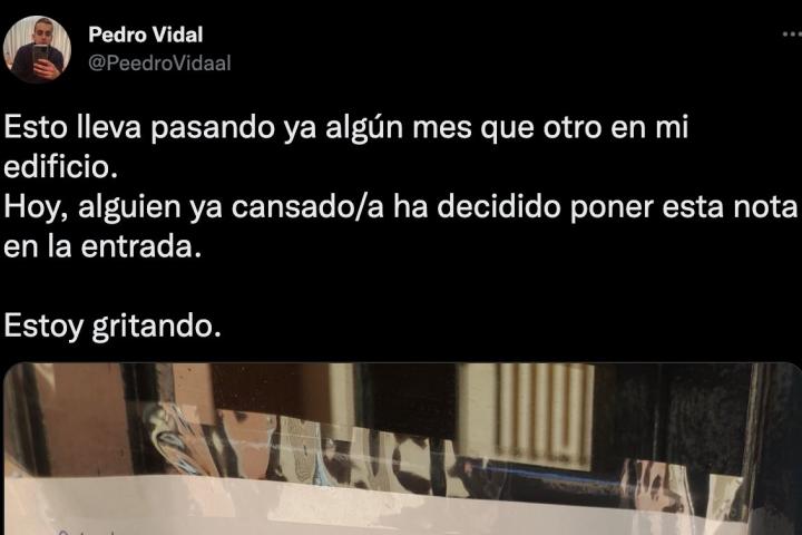 Uno de los últimos ejemplos lo ha subido la cuenta de Twitter @PeedroVidaal, que ha publicado en la red social del pájaro azul una nota que han dejado en su edificio.
