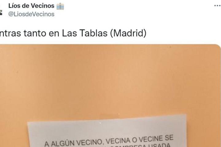 “A algún vecino, vecina, vecine se le ha caído una compresa usada por la ventana. No es la primera vez que ocurre, pero sí será la última en la que no haya consecuencias”, se puede leer en el mensaje.