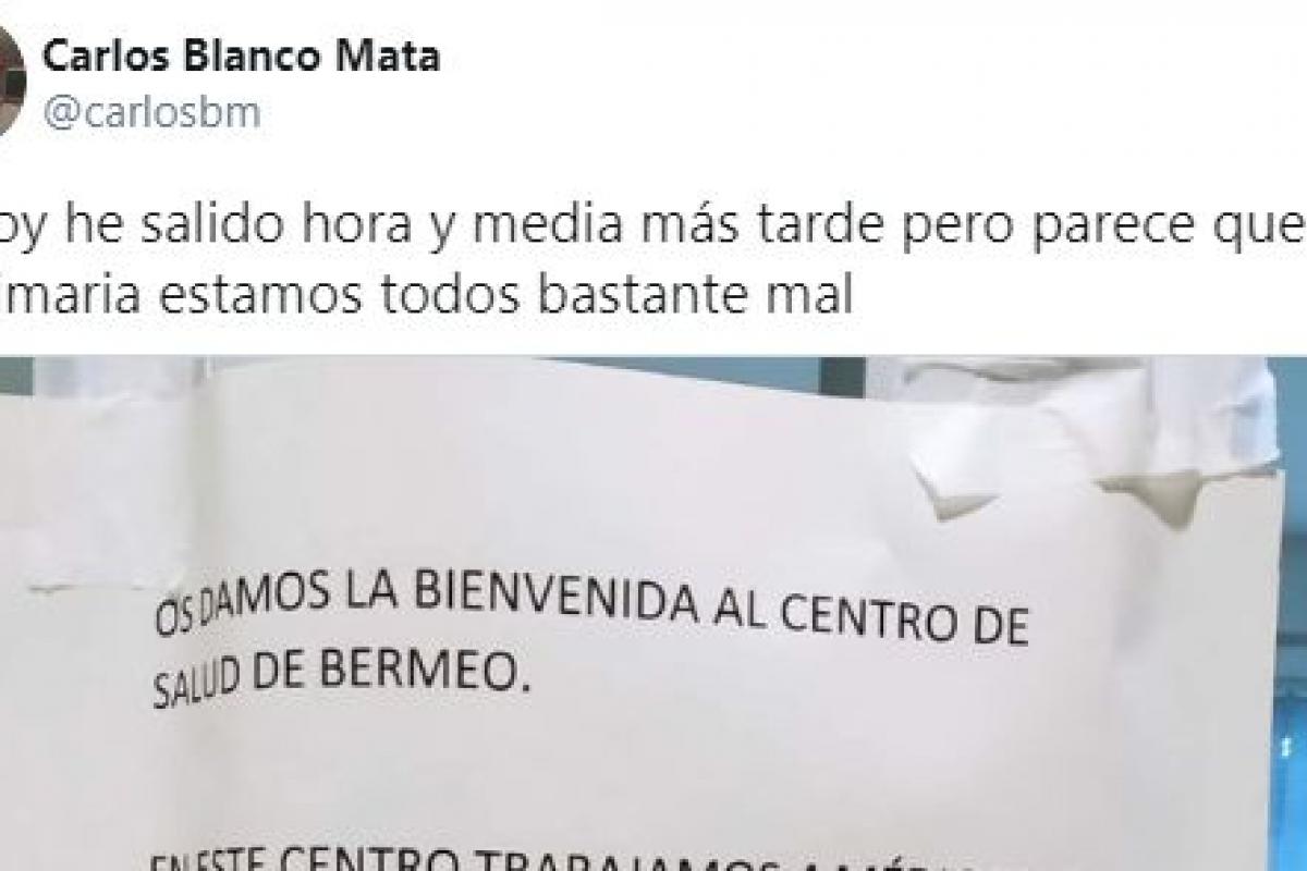 Un jefe de Atención Primaria de un centro de salud del País Vasco, Carlos Blanco, ha compartido el cartel que ha visto en un centro de Bermeo. “Yo hoy he salido hora y media más tarde pero parece que en la Primaria estamos todos bastante mal”, ha reflexionado.