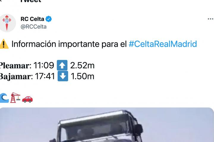 “Información importante para el Celta-Real Madrid”, dice el tuit, “Pleamar: 11:09. 2,52m. Bajamar: 17:41. 1,50m”, prosigue el mensaje, que viene ilustrado con una imagen de un coche tratando de transitar sobre el agua.
