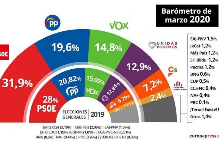 El Centro de Investigaciones Sociológicas (CIS) otorgaba al PSOE un 31,9% en estimación de voto, un punto más que el mes anterior y 12,3 puntos por encima del PP, en una encuesta elaborada en la primera semana de marzo, días antes de la declaración del estado de alarma en España por el coronavirus.