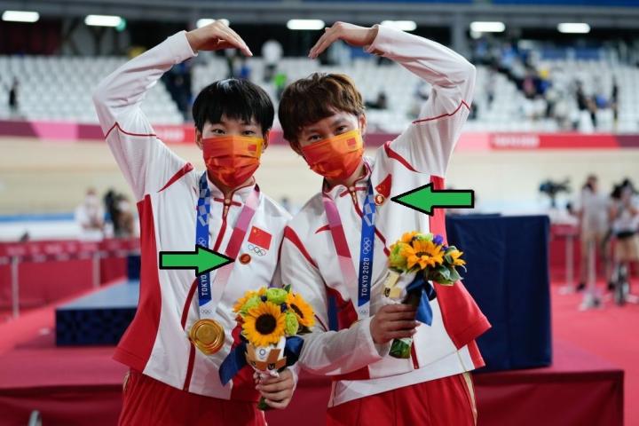 Las ciclistas Zhong Tianshi y Bao Shanju, que lograron el oro en la prueba de velocidad por equipos el pasado lunes, subieron al podio en la ceremonia de entrega con unas insignias del fundador y primer líder (1949-1976) de la República Popular China decorando sus equipaciones.