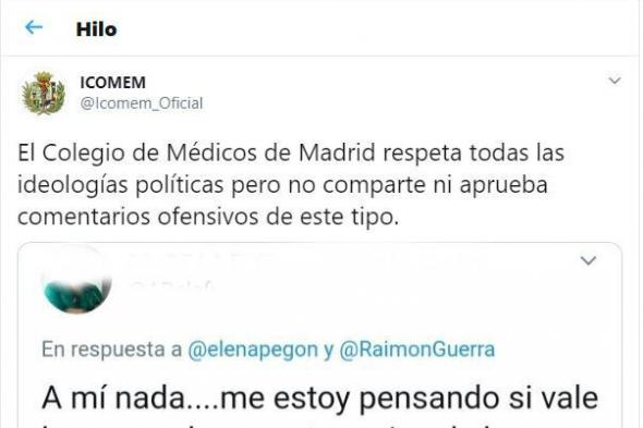 “El Colegio de Médicos de Madrid respeta todas las ideologías políticas pero no comparte ni aprueba comentarios ofensivos de este tipo”, ha escrito el organismo en referencia a ese tuit.