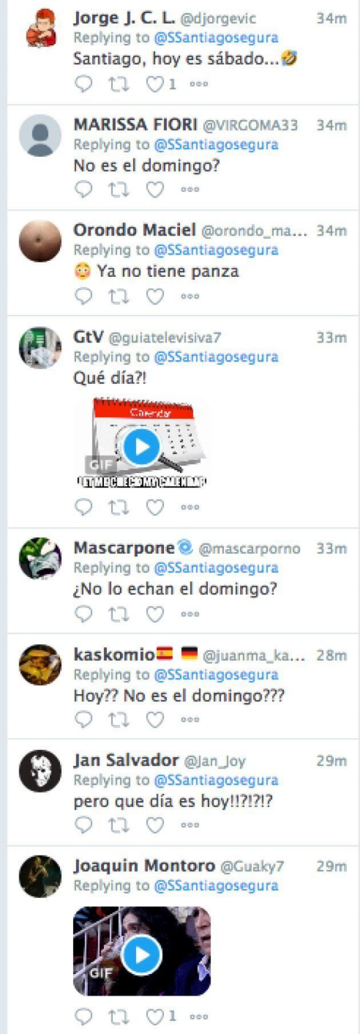 El problema es que ha cometido un pequeño desliz. A Segura le han bailado las fechas y donde tenía que poner domingo o mañana ha escrito "esta noche". Y esta noche de sábado lo que se emite es Informe Semanal y 14 de abril: La República.