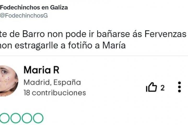 Ahora, este comentario se ha hecho viral en Twitter. Además de la captura de pantalla, el perfil de Fodechinchos en Galiza ha puesto un irónico comentario: “La gente de Barro no puede bañarse en las cascadas para no estropear la foto de María”.