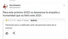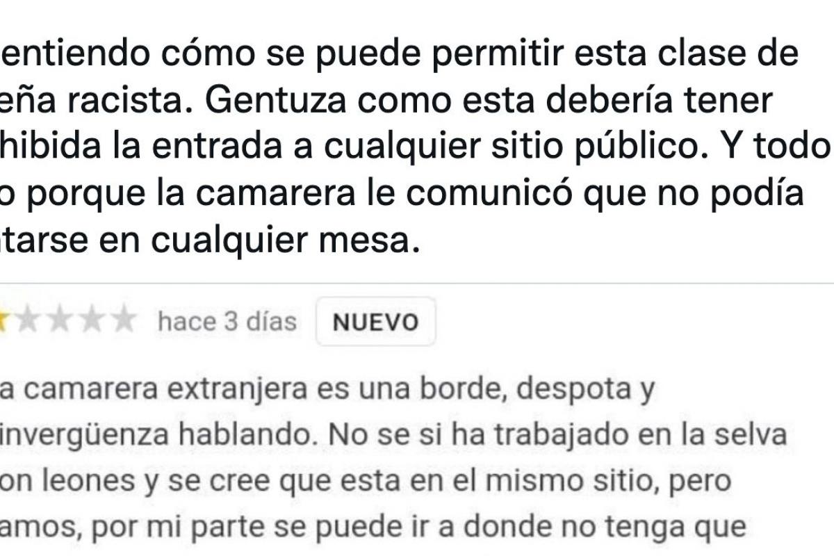 “No entiendo cómo se puede permitir esta clase de reseña racista. Gentuza como esta debería tener prohibida la entrada a cualquier sitio público. Y todo esto porque la camarera le comunicó que no podía sentarse en cualquier mesa”, ha escrito cabreado Soy Camarero, cuenta con más de 30.000 seguidores en Twitter y más de 300.000 en Instagram.