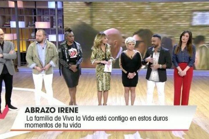 Emma García, rodeada de sus colaboradores, en fila y con gesto serio. El programa Viva La Vida (Telecinco) ha comenzado este sábado del modo más triste. El espacio de sobremesa y tarde ha querido tener un recuerdo especial con una de las suyas, Irene Rosales, tras la pérdida de su madre.