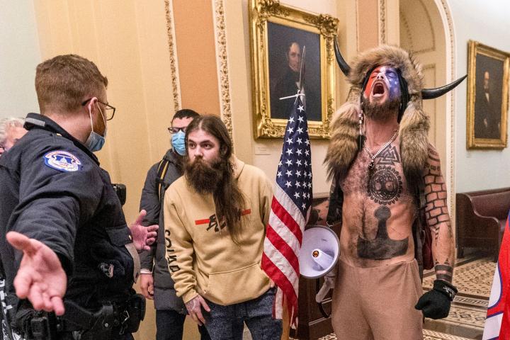 Varios de los asaltantes del Capitolio, el 6 de enero de 2021, interpelados por un agente. Manuel Balce Ceneta via AP