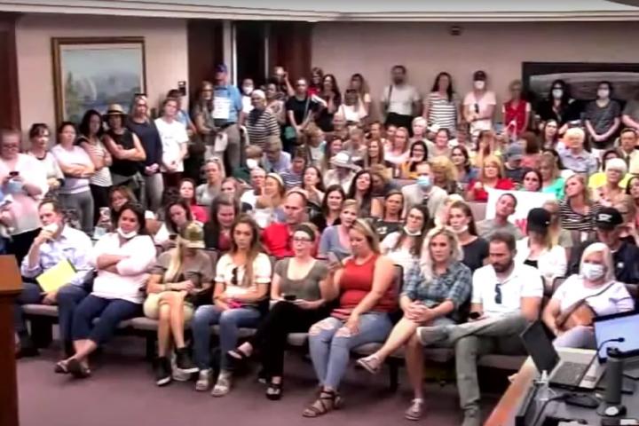 Las imágenes hablan por sí solas, con decenas de personas abarrotando una pequeña sala de reuniones. La mayoría, sin mascarilla. Algunos, con niños pequeños. Otros, con carteles en contra del uso de mascarillas.