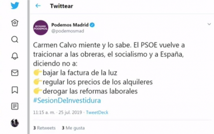 11.59 horas. Podemos Madrid llama mentirosa a Calvo en Twitter, Echenique lo critica y el tuit desaparece