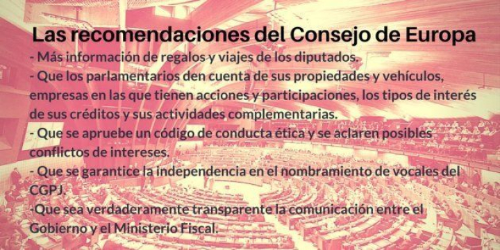 El Grupo de Estados contra la Corrupción (GRECO), dependiente del Consejo de Europa, ha advertido a España de que los parlamentarios deberían informar públicamente de los regalos que reciben y los viajes a los que son invitados, así como ofrecer una serie de detalles sobre sus créditos financieros.