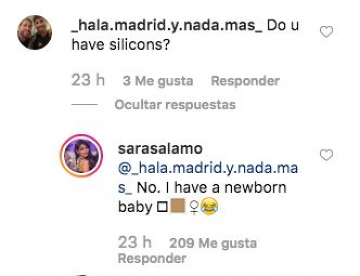 La mayoría de las respuestas han sido positivas, salvo una. Un usuario le ha preguntado en inglés si tenía “siliconas”. Viendo el revuelo que ha generado este comentario, Sálamo ha decido responder.