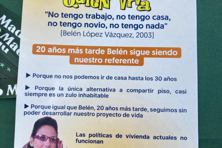 “20 años más tarde, Belén sigue siendo nuestro referente. Porque no nos podemos ir de casa hasta los 30 años. Porque la única alternativa a compartir piso, casi siempre es un zulo inhabitable. Porque igual que Belén, 20 años más tarde, seguimos sin poder desarrollar nuestro proyecto de vida”, se lee en los folletos de Más Madrid.