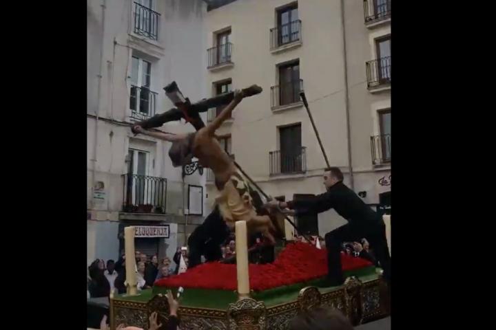 Y ahora, la imagen del día: la del Cristo de las Gotas de Burgos, que se ha precipitado hacia adelante rompiéndose el brazo izquierdo, según informa el Diario de Burgos, que ha compartido un vídeo del momento.
