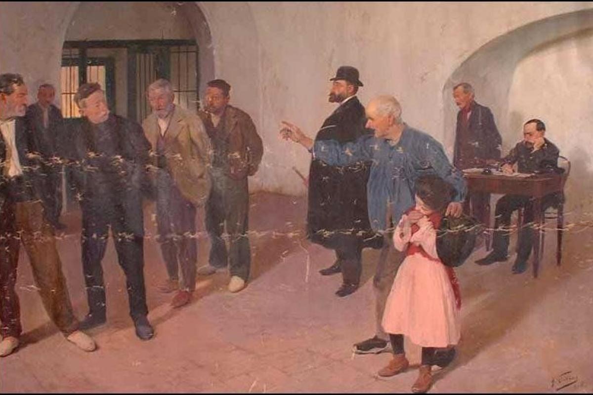 La pequeñez de la niña recibe toda la carga emocional de la escena, se muerde las manos medio escondiéndose la cara llena de temor, pese a estar arropada por el abuelo, que la anima cariñosamente a delatar a su violador. Mientras, cuatro presos pasan delante y dos de ellos se vuelven en actitud soberbia. El pintor nos pone en la tesitura de descubrir entre los rostros y los gestos de los cuatro hombres al culpable de semejante salvajada, pero también nos permite la duda sobre si existe más de un agresor en la estancia. Al mismo tiempo, nos plantea otras preguntas ¿Dónde está el padre? ¿Por qué la pequeña no está acompañada por su madre? Sin duda el pintor nos está situando ante un escenario sobrecogedor y de gran dureza.