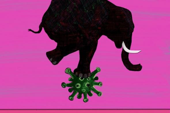 La estrategia del miedo ante la pandemia nos presenta una imagen inquietante colocando a un torpe e inmenso cuadrúpedo sobre el virus. Para aumentar el estrés, además, se renuncia a la estabilidad natural que le otorga su morfología. Arriesgándolo todo al equilibrio irracional que le ofrece el apoyo sobre una sola pata.