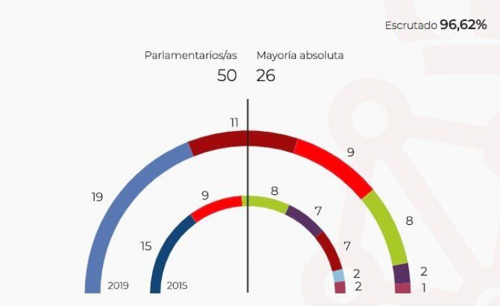 Geroa Bai, tercera formación en votos y ediles, iguala sus registros de 2015 -9 asientos-, al igual que Bildu, que mantiene sus 8. Por detrás, Podemos baja notoriamente, de siete a dos y cierra la cámara IE, con un único escaño.