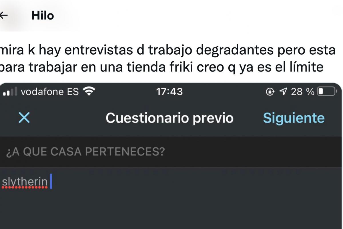 “Mira que hay entrevistas d trabajo degradantes pero esta para trabajar en una tienda friki creo que ya es el límite”, ha compartido la usuaria de Twitter que, como se puede ver en la captura de pantalla, ha escrito que es de Slytherin.