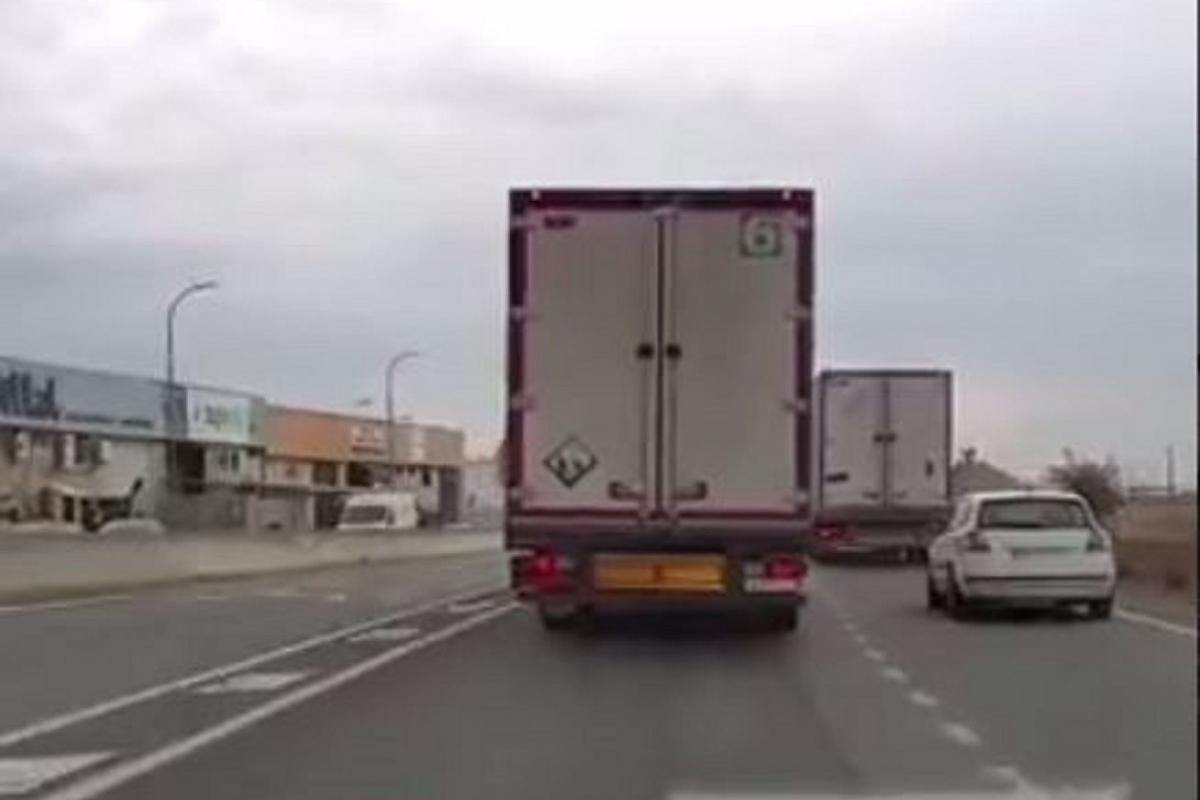 En el vídeo se ve cómo un coche circula por un carril de aceleración e intenta incorporarse al principal. Trata de hacerlo acelerando para superar al camión que circula por su izquierda, pero no puede superarlo porque justo delante tiene a uno parecido.