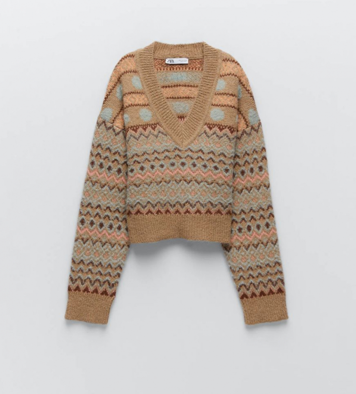 Cómodo no tiene porque ser aburrido, y este jersey lo demuestra. Es un modelo holgado, estampado en patchwork y de escote en pico. Zara tiene un diseño de punto con un juego de estampados que, aunque en un tejido diferente, puede emular el de la serie.