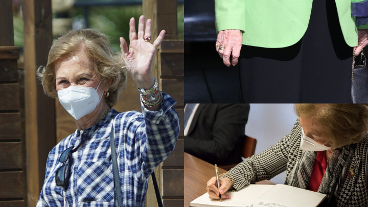 La reina Sofía en sus tres últimas apariciones sin el anillo de compromiso: a la izquierda, en la playa de la Cala del Moral (Málaga); arriba a la derecha, en el banco de alimentos de Toledo; abajo a la derecha, en el banco de alimentos de Al...GTRES