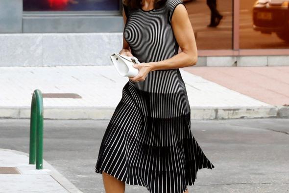 La revista destaca que este vestido, de la marca Hugo Boss, y que Letizia estrenó en 2017, “cuenta con un print de rayas en blanco y negro que crea un juego visual de falso plisado al ensancharse en el bajo, un efecto que ha protagonizado numerosos titulares cada vez que lo ha llevado”.
