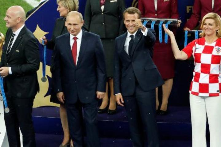 En cuanto las primeras gotas han caído sobre el césped, un asistente se ha apresurado a sacar un paraguas (uno solo, a la espera de que alguien más repitiese la acción) para tapar a las autoridades encargadas de entregar los premios a los futbolistas de las selecciones francesa y croata.