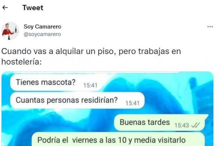 ¿La razón? Ese breve diálogo muestra las miserias de dos sectores: el inmobiliario y el hostelero. “Cuando vas a alquilar un piso, pero trabajas en hostelería”, dice la cuenta junto al pantallazo de WhatsApp, en el que se ve la conversación entre una persona que quiere alquilar un piso y el dueño del mismo.