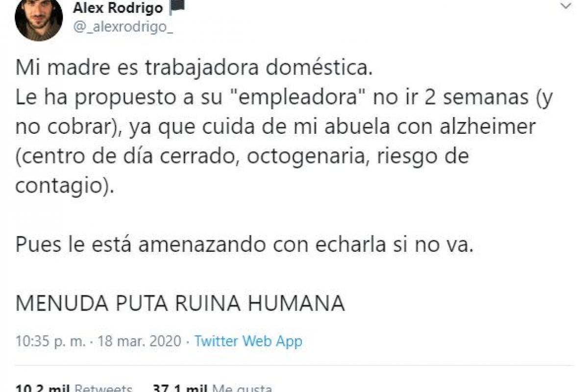 “Mi madre es trabajadora doméstica. Le ha propuesto a su “empleadora” no ir 2 semanas (y no cobrar), ya que cuida de mi abuela con alzheimer (centro de día cerrado, octogenaria, riesgo de contagio). Pues le está amenazando con echarla si no va. MENUDA PUTA RUINA HUMANA”, ha asegurado.