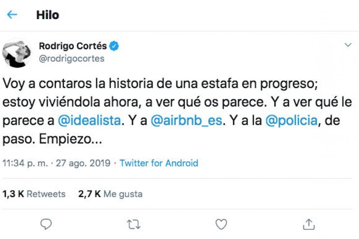 El también actor pone el caso en conocimiento del Idealista, el portal inmobialiario a través del que le llegó el mensaje, y Airbnb, otra plataforma que los delincuentes utilizaron como excusa para su timo.
