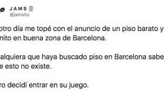 “Así que estoy abierto a ideas (¿@policía, @idealista, @airbnb_es). Sobre mi próximo movimiento, porque empiezo a pensar que la relación entre María y yo podría enturbiarse y acabar por malograr una operación que llevábamos, la verdad, muy avanzada”, dice.
