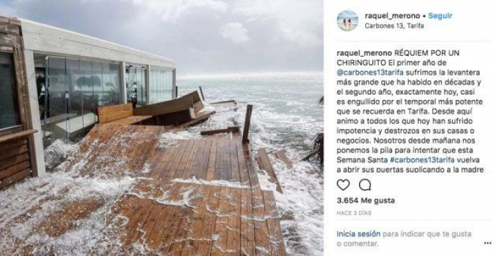 "Réquiem por un chiringuito", comienza el texto que acompaña a una imagen del local destrozado a orilla del mar. En el texto, Meroño explica que, en su primer año, el chiringuito sufrió los efectos de "la levantera más grande que ha habido en décadas" y que en el segundo, este, ha quedado muy dañado por "el temporal más potente que se recuerda en Tarifa".