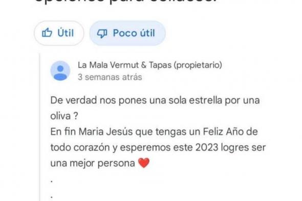 Para rematar dice que “estaría bien tener más opciones para celíacos”. Y la respuesta del dueño no se ha hecho esperar. ”¿De verdad me pones una sola estrella por una oliva?”, pregunta el hostelero sorprendido.