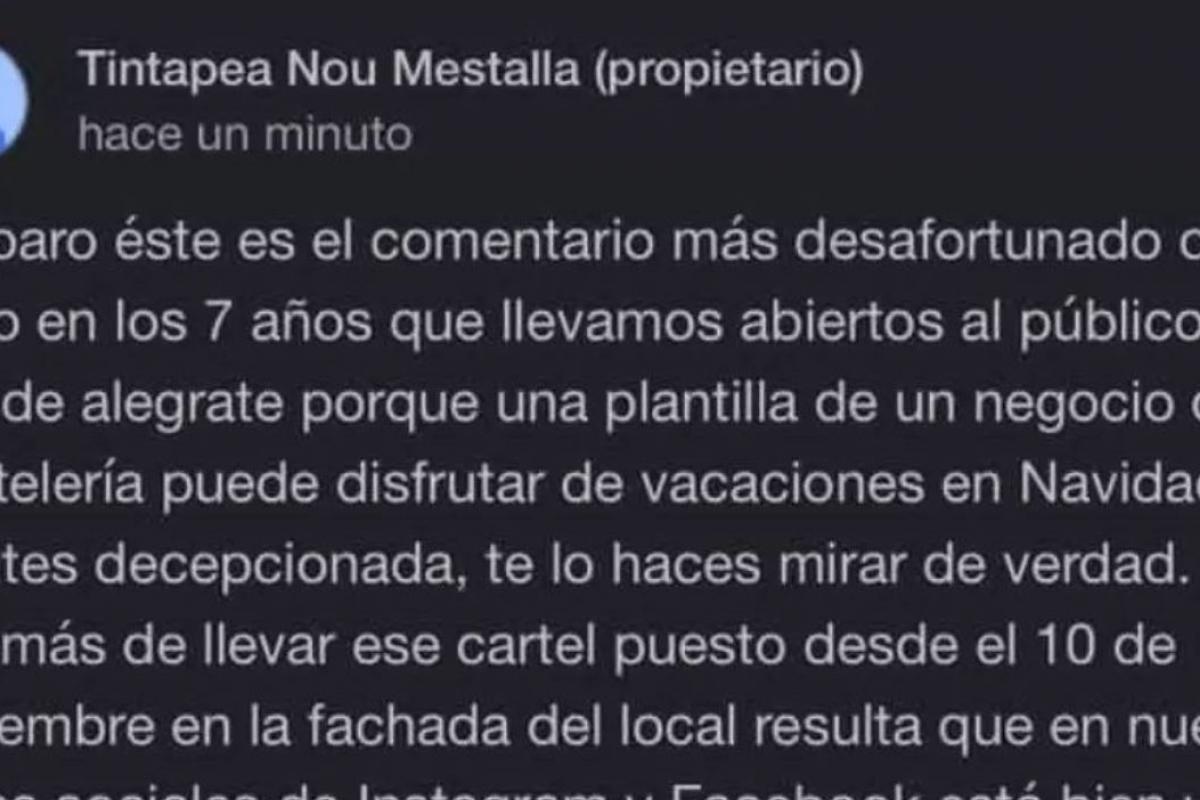 La réplica del dueño no se ha hecho esperar y ha calificado el comentario de la mujer como “el más desafortunado” que ha leído en siete años que lleva abierto al público.
