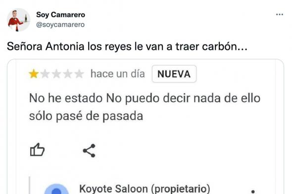 La cuenta Soy Camarero, dedicada a compartir contenido relacionado con la hostelería, se ha hecho eco de esta reseña y ha escrito con humor junto a una captura de pantalla con el texto: “Señora Antonia los reyes le van a traer carbón...”.