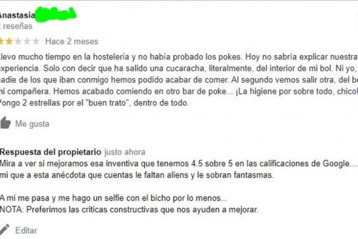 Se ha quejado la usuaria de que ha encontrado una cucaracha en su plato: “Llevo mucho tempo en la hostelería y no había probado los pokes. Hoy no sabría explicar nuestra experiencia. Solo decir que ha saludo una cucaracha, literalmente, del interior de mi bol”.