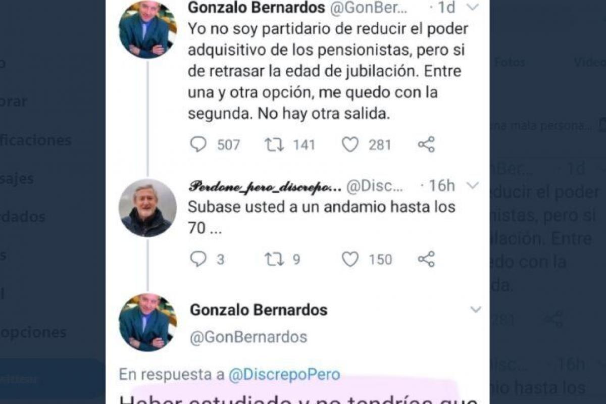 “Pido disculpas si he ofendido a alguien. No era mi intención. Una frase en un tuit no era apropiada”, ha reconocido Bernandos antes de apuntar: “Soy humano y después de vejaciones e insultos por decir que las pensiones del futuro serán menos generosas que las del pasado, me ha salido una frase desafortunada”.