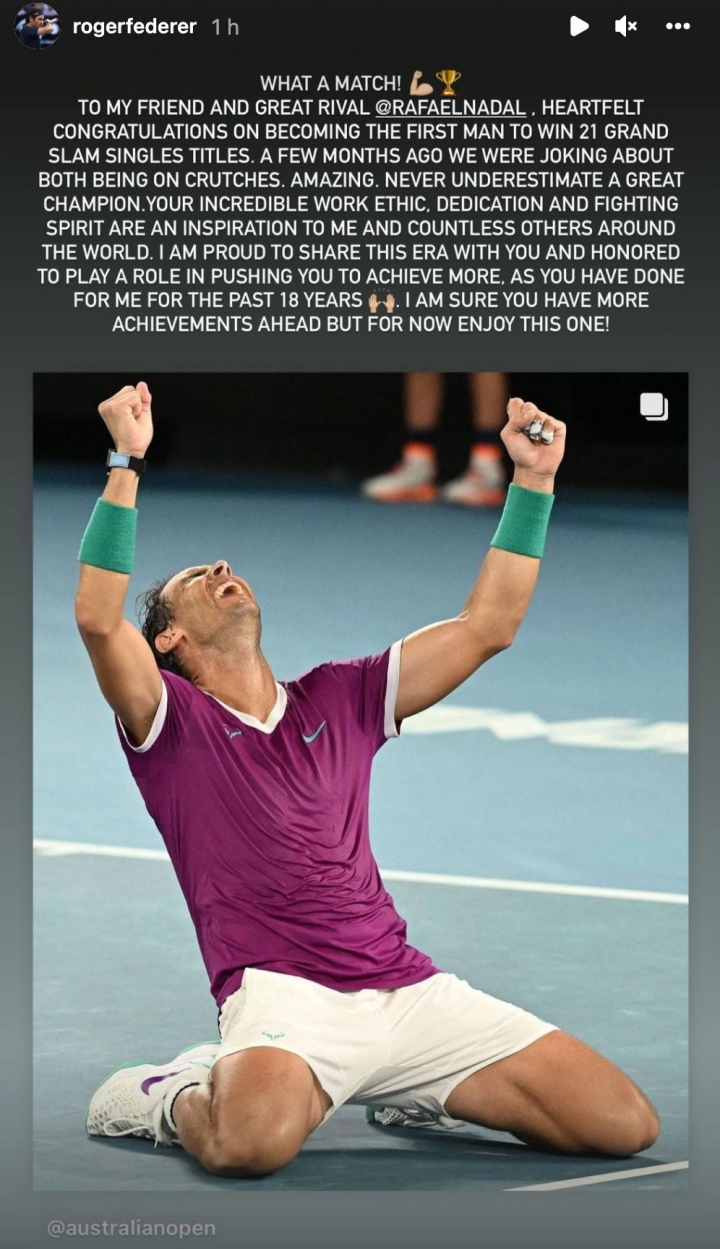″¡Qué partido!”, ha escrito Federer, quien ha felicitado al tenista español por su proeza.